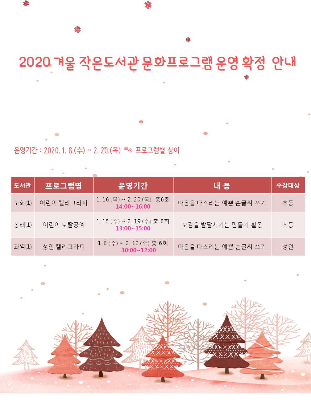 - 첨부파일 2020 겨울 작은도서관 프로그램 운영 확정 안내.jpg (110.66 KB) 다운로드