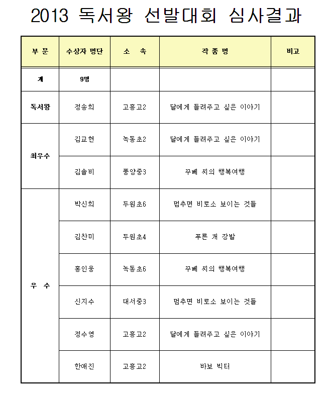 - 첨부파일 2013 독서왕 선발대회 심사결과.bmp (1.47 MB) 다운로드