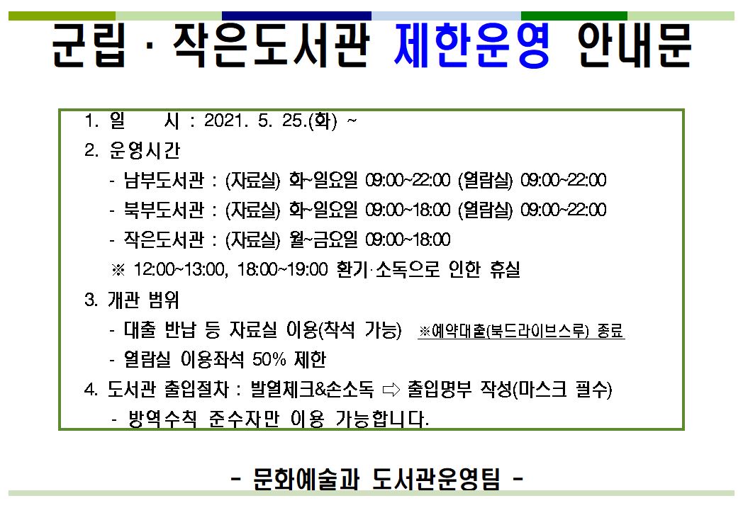 군립 및 작은도서관 제한 운영 안내('21.5.25. ~ )